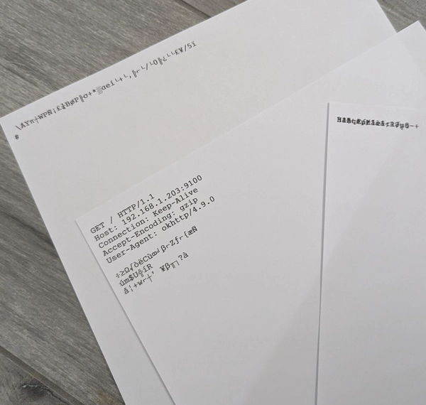 To my surprise, the printer sprang to life and started printing out the HTTP requests it was sent. Why did this happen? Printers typically listen to port 9100 for print jobs. However, it seems some are configured to treat data received as if they were print jobs. The outcome: the printer treats the HTTP requests as text files and prints them out without question.